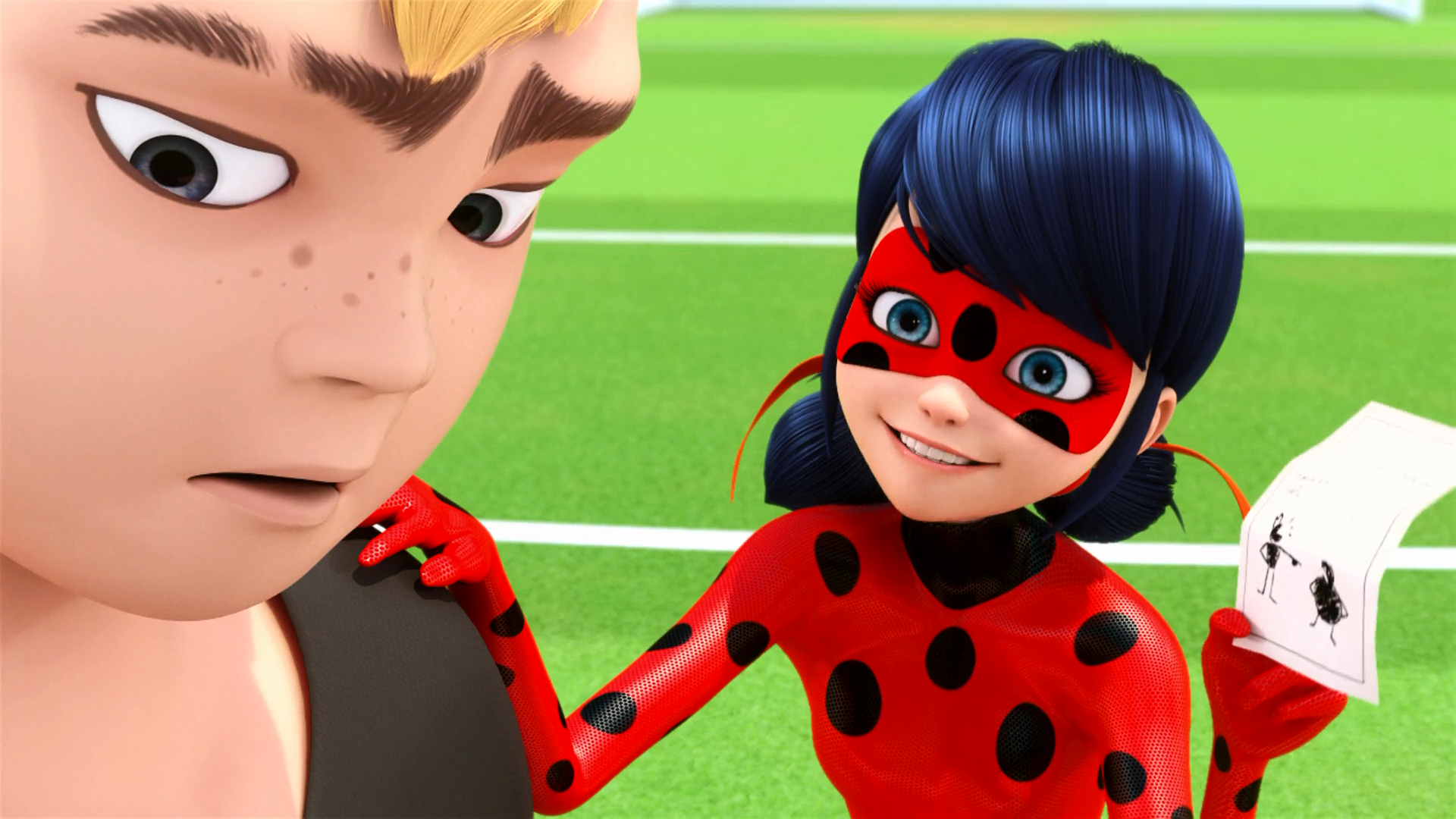 Marinette glisse un tuyau d'arrosage dans la combinaison et utilise son yoyo pour envoyer Chat Noir sur Cœur de pierre qui l'attrape dans sa main gauche. Marinette saute avec la combinaison vers Cœur de pierre qui, pour l'attraper, lâche la boule de papier qu'il tenait dans sa main droite. Marinette hurle à Alya d'ouvrir le robinet, libérant ainsi Marinette qui se hâte de briser la boule de papier. L'akuma s'envole et Ivan redevient normal tandis que Chat Noir s'extasie sur sa partenaire. Chat Noir la félicite et Marinette ajoute qu'ils ont tous les deux bien travaillés. N'ayant plus beaucoup de temps, Chat Noir quitte le stade et Marinette lit le mot d'Ivan, découvrant la cause de sa colère. Marinette le console en lui disant qu'il n'a pas à avoir honte de dire à Mylène qu'il l'aime et au moment où Ivan lui demande comment elle connaît son nom, ils sont interrompus par Alya qui pose tout un tas de questions. Marinette se présente sous le nom de Ladybug puis elle quitte le stade.