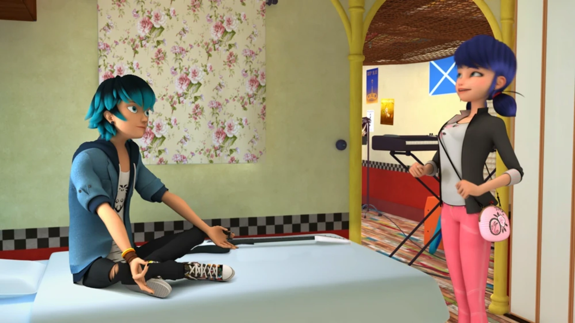 Marinette scende nella cabina di Luka. Dopo averlo visto seduto a gambe incrociate sul letto, balbetta involontariamente mentre cerca di presentarsi e dice che tutti lo stanno aspettando. Luka saluta e stuzzica scherzosamente la sua balbuzie, ma si scusa subito e spiega che di solito ha più senso con la sua chitarra, che inizia a suonare. Marinette si siede sul letto di Luka e ascolta. È stupita dal suo talento. Luka spiega che trova la musica più semplice delle parole. Marinette scende dal letto e si avvicina a una foto di Jagged Stone e della collezione di plettri di Luka. Prende un plettro per chitarra con disegnato sopra Jagged Stone. Luka e Marinette affermano entrambi che Jagged Stone è il loro cantante preferito. Quindi Luka dice a Marinette che può tenere il plettro. Dice a Marinette che si unirà al "groove"; un riferimento a quando Marinette stava cercando di dire il gruppo, ma invece ha detto groove. Sentendosi imbarazzata, Luka fa sentire meglio Marinette complimentandosi per il fatto che è una ragazza divertente. Marinette guarda Luka mentre lui si allontana e lei guarda il suo nuovo plettro prima di metterselo in tasca.