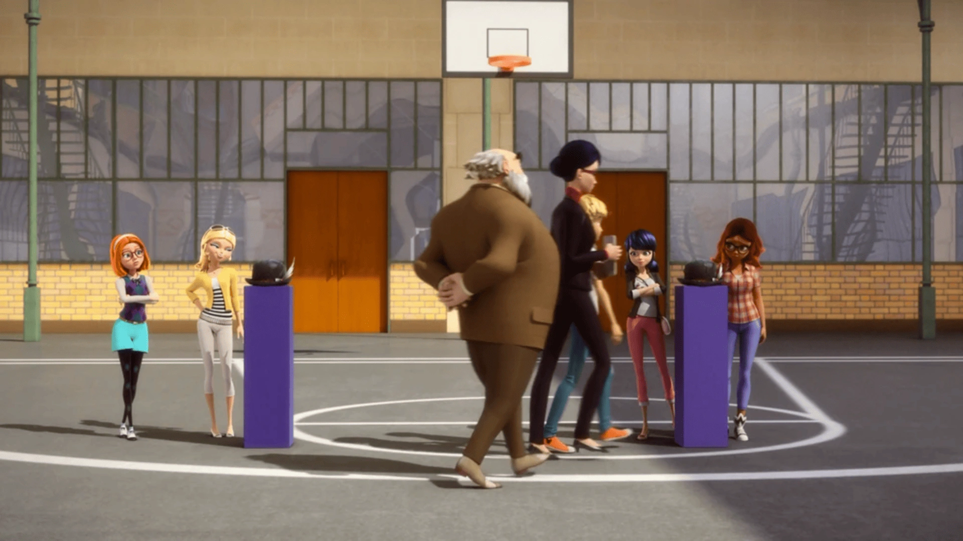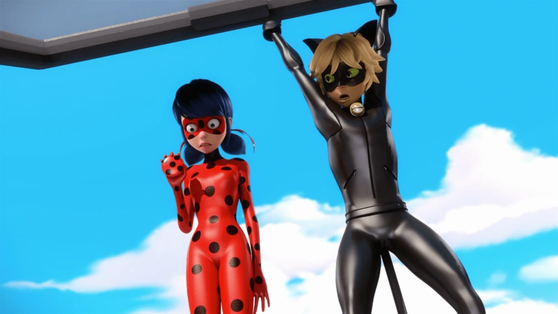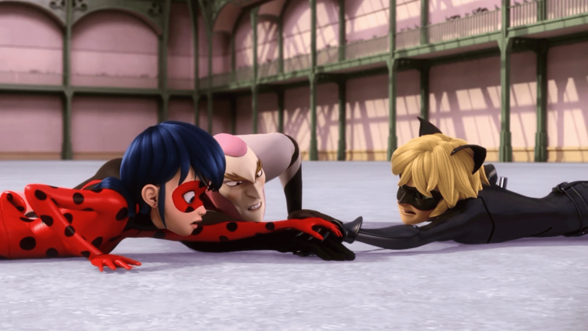 Ladybug, da un punto di osservazione più alto, guarda fuori da una finestra e vede che i piccioni volano nella stessa direzione. Chat Noir appare in un ascensore ei due seguono i piccioni. Raggiungono il Grand Palais e trovano i custodi del parco ingabbiati all'interno. Si arrampicano sul tetto per entrare nell'edificio da una finestra.