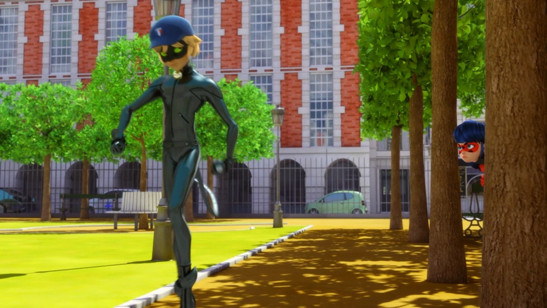 Vanno a Place des Vosges e Chat Noir si traveste come custode del parco, tenendo d'occhio Mr. Piccione. Fischia l'inno francese e inizia a ballare. Ladybug gli dice di comportarsi in modo naturale, altrimenti Mr. Piccione non apparirà mai. Chat Noir risponde, dicendo che si sta comportando in modo naturale, ballando ancora. Un piccione lo vede e vola via per fare rapporto a Mr. Piccione