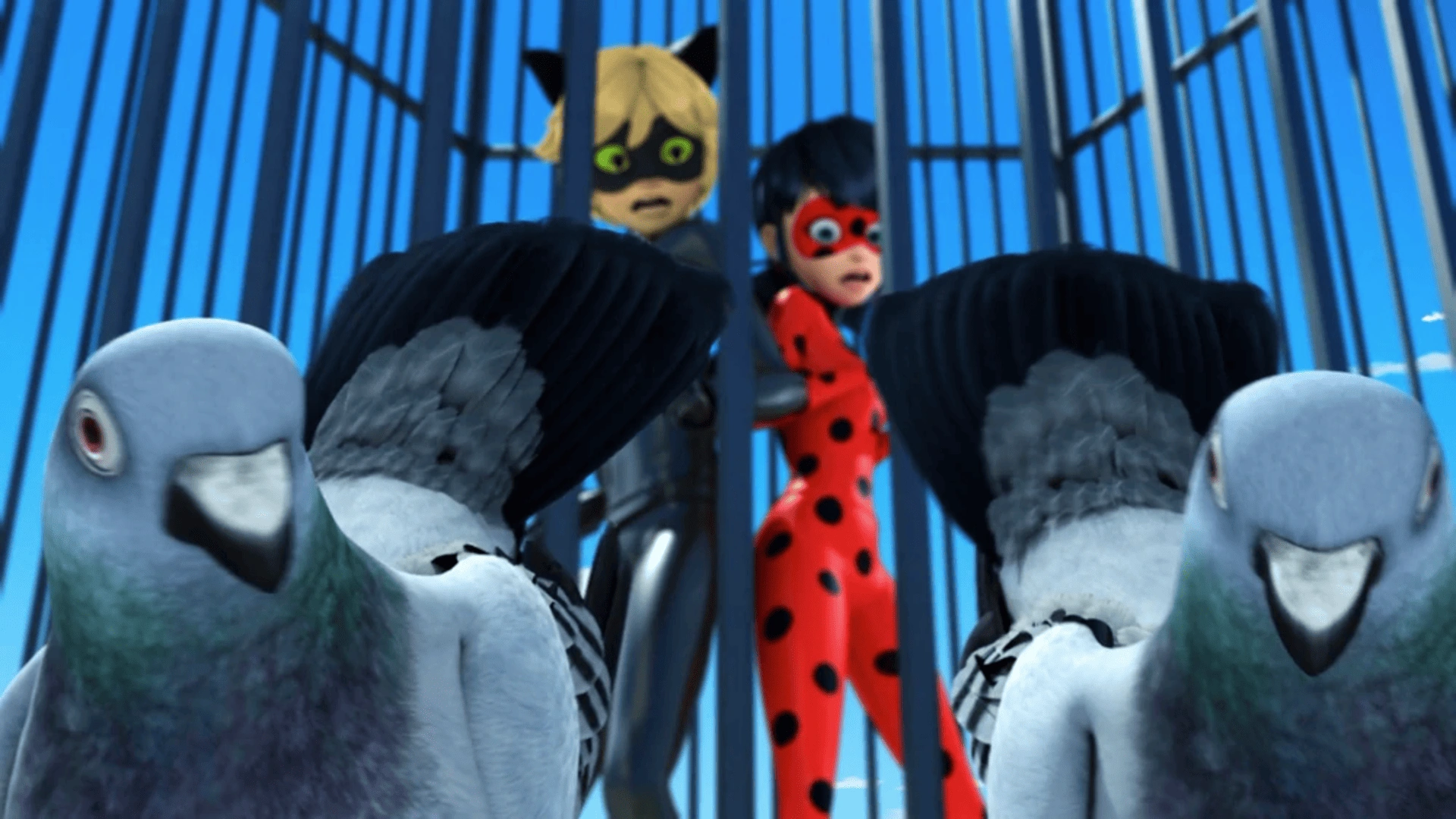 Ladybug si chiede dove sia Mr. Piccione. All'improvviso, Chat Noir starnutisce e uno stormo di piccioni lo porta via. Ladybug segue la nuvola fino al soffitto dell'hotel Le Grand Paris. Chat Noir starnutisce di nuovo, ora libero, e vede che i piccioni lo stanno guardando. Improvvisamente, appare Mr. Piccione, in piedi su uno stormo di piccioni. Suona il suo fischietto per uccelli e i piccioni circondano Ladybug e Chat Noir, intrappolandoli in un'enorme gabbia per uccelli.
