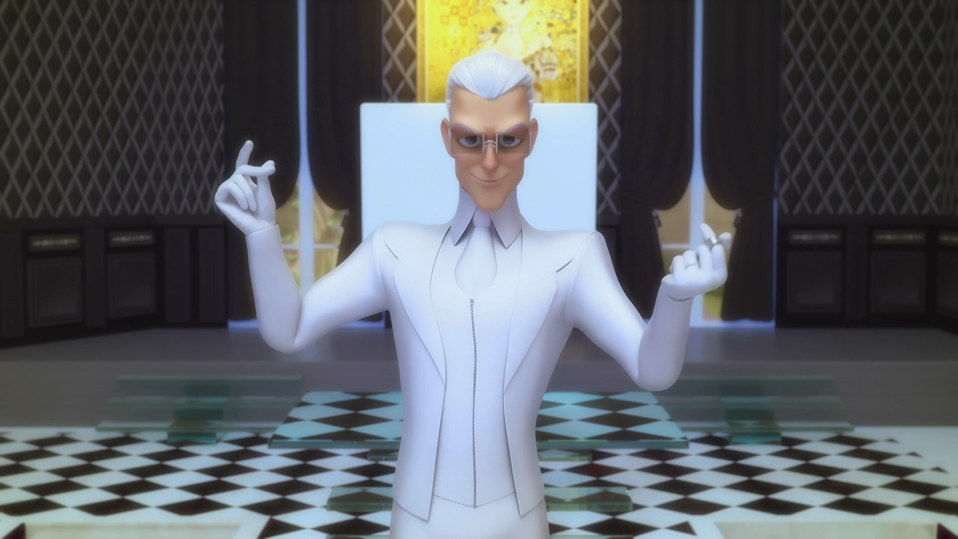 W międzyczasie w swoim gabinecie pojawia się Gabriel, wjeżdżający na górę z pomocą windy. Po chwili mężczyzna uśmiecha się, rusza ramionami, a następnie w tle zaczyna lecieć piosenka z radia. Agreste odwraca się tyłem do obrazu Emilie i idzie schylony, zeskakując z podwyższenia, po czym wchodzi po schodkach, podchodząc do ekranu. Przy nim okręca się wokół własnej osi, a następnie znów zeskakuje na szklane podwyższenie na środku pokoju. Mężczyzna podchodzi parę kroków, pstrykając palcami, po czym cofa się, machając dłońmi.