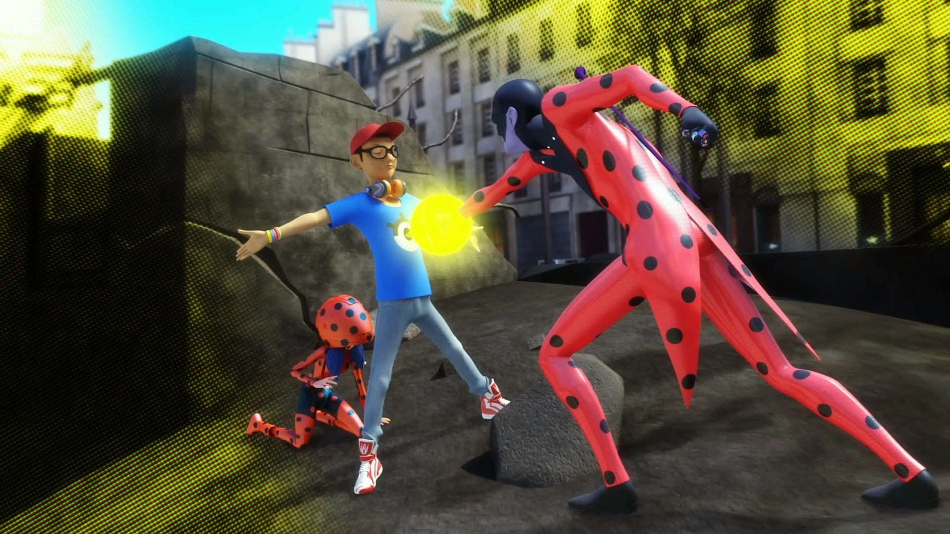 W międzyczasie Marinette czeka z telefonem przy uchu i jest przerażona tym, co zauważa dookoła – „wyrastaniem” i znikaniem budowli. W słuchawce odpowiada poczta głosowa Alyi. Dziewczyna decyduje się sprawdzić kabinę toaletową, przedtem rzucając spojrzenie Nino pomagającemu wstać Adrienowi. Ciemnowłosy zastanawia się, dlaczego superbohaterowie się nie zjawili i co się dzieje, a jego przyjaciel obstawia, ze mają co innego do zrobienia.