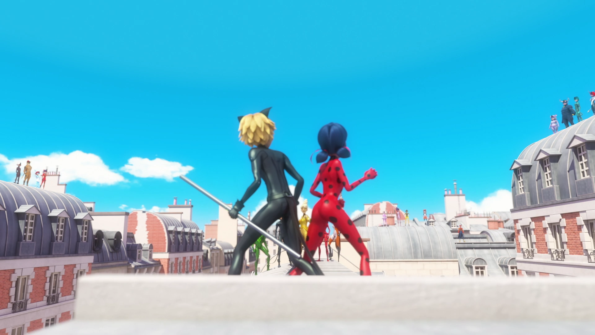 W międzyczasie Biedronka i Czarny Kot pokonują woskowych superbohaterów i zdobywają ich ulotki, które rozrywają, by dziewczyna mogła złapać fragment Mega-Akumy. Najpierw biegną przez paryskie dachy, gdzie niszczą figury Pigelli i Fioletowej Tygrysicy, później skaczą na plac przed ratuszem i zamykają klony Multimyszy w wiadrze. Następnie stają do boju z Królem Małp i Pegazem. W kolejnej scenie duet, w formach wodnych, wraz z figurą Ryuko wyskakuje z wody, po czym tak jak w pozostałych przypadkach niszczą kartkę, a Biedronka łapie pył w Jo-jo. Po tym Kot wymachuje Kijem i chce iść do ratusza, ale Biedronka zatrzymuje go, nieśmiało mówiąc, że ostatnio jest w świetnej formie. Ten tłumaczy to tym niechęcią popełnienia większej liczby błędów. Po tym oboje biegną do budynku.