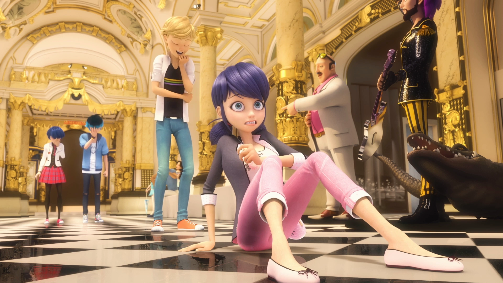 Tymczasem Adrien pragnie powrócić do rozmowy z dziewczyną o swoich uczuciach, ale Marinette ucieka i zaczyna rozmawiać z figurami. Podbiega do woskowego Boba Rotha i przypomina mu o obiecanym kontrakcie, podchodzi do sztucznego Jaggeda Stone’a z Fangiem, mówiąc „rock and roll”. Po tym wita się ze stojącym nieopodal burmistrzem, pytając o spotkanie, ale wtedy okazuje się, że jest on prawdziwy. Rusza się, co też przeraża dziewczynę, która natychmiast upada. Adrien śmieje się, ale Kagami i Luka uderzają się w twarze.