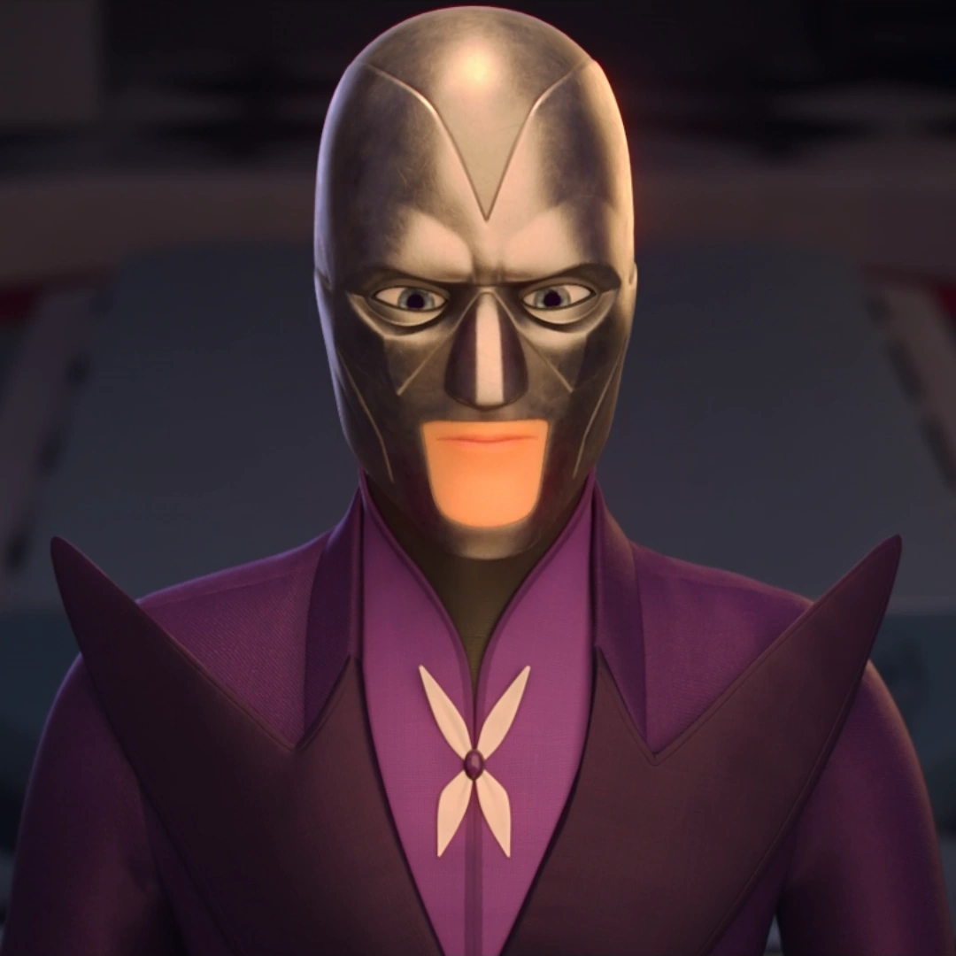Usa terno roxo extravagante com gola em V larga, calças da mesma cor e capuz cinza cobrindo o rosto, deixando apenas os olhos e parte da boca visíveis. O Miraculous da Borboleta está abaixo do pescoço como broche. Geralmente carrega um bengala roxo escuro.