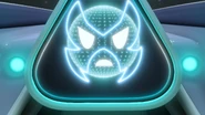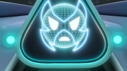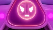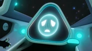 A.D.A. is an A.I. that has been incorporated in a space jet with a triangular shape and made of black and white/light grey colored steel. On the screen, she appears as a spherical face with two white eyes and a white mouth.