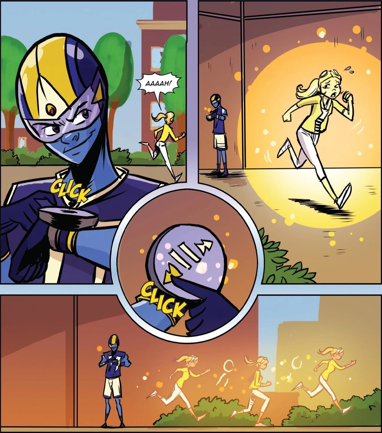 Replay possesses the power to alter the flow of time on objects and living beings around him using his stopwatch. By Replay pressing buttons on his watch, the watch shoots a yellow beam of light that can pause an object, rewind its actions, or fast forward its actions. For example, he uses the watch to pause and rewind Chloé when she confronts him, reversing her movements and forcing her back to her place.