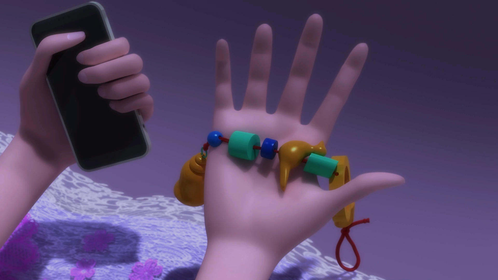 The lucky charm bracelet is made from red string, which is tied in a loop at one end for when the bracelet is not tied to a wrist. The bracelet has nine beads: