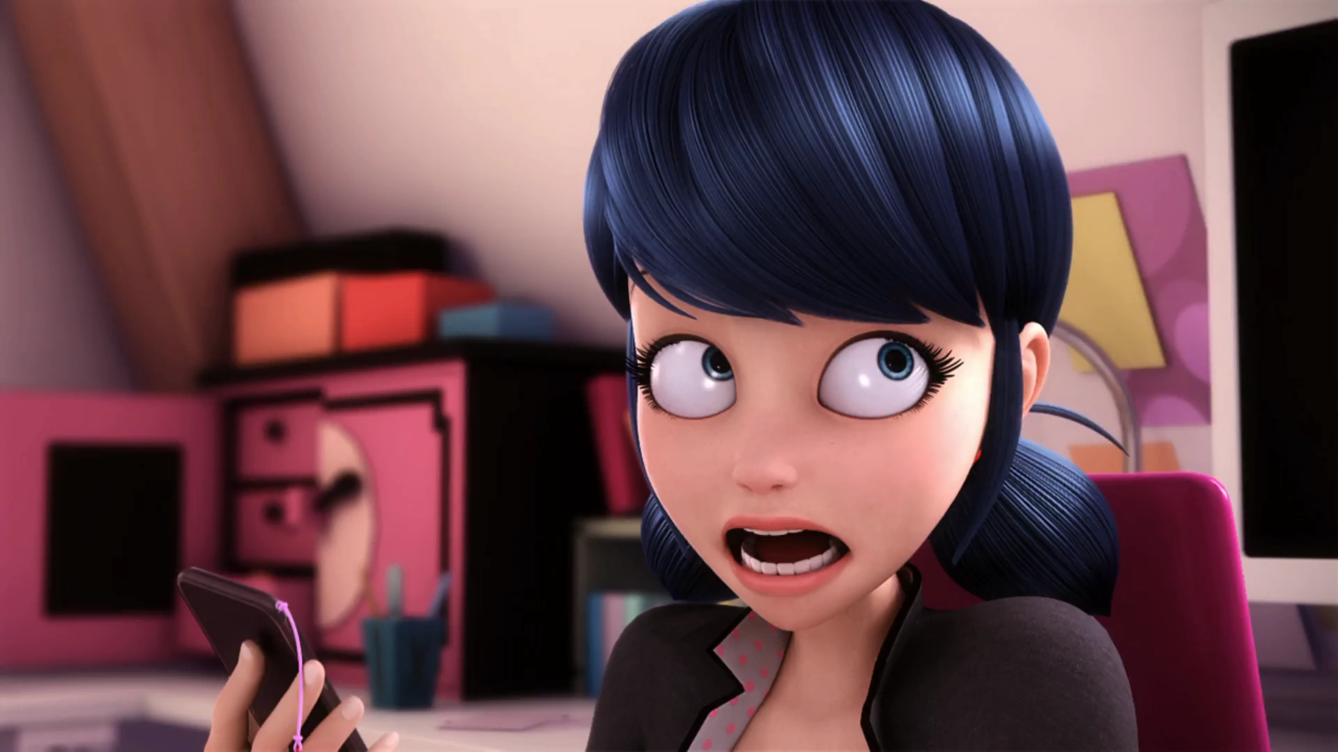 - Marinette's phone also switches between models over the course of the episode, and in the scene where she calls it high-tech, her phone is using the identical model as Adrien's instead of the rounder black and white one.
