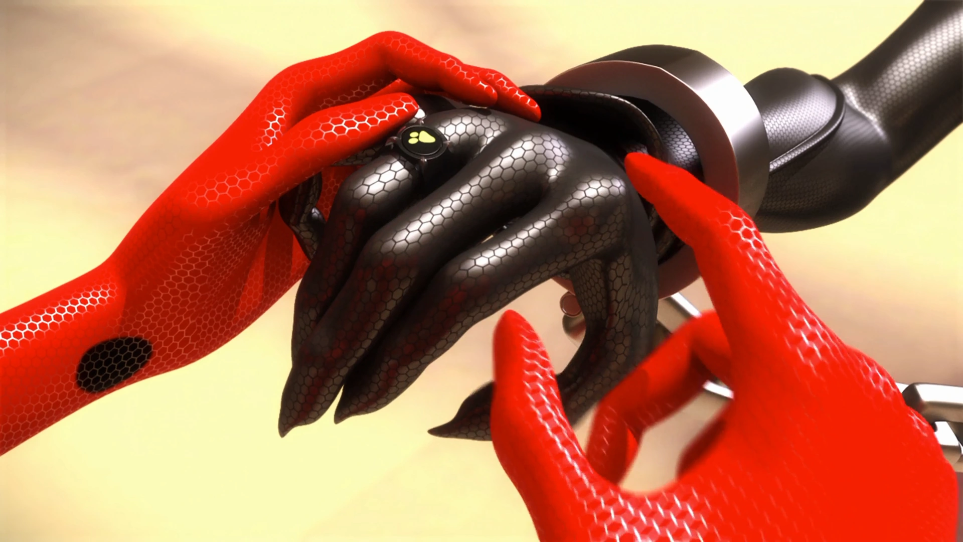 Ladybug about to take off the real Cat Noir's ring.