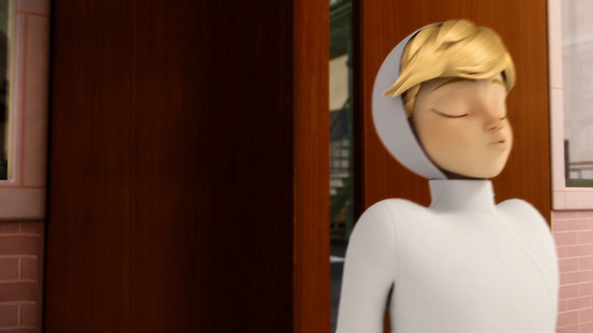 In the car, Adrien hears of the theft and hurries into the school, transforming into Cat Noir and running off to the Louvre. His driver waits outside the school.