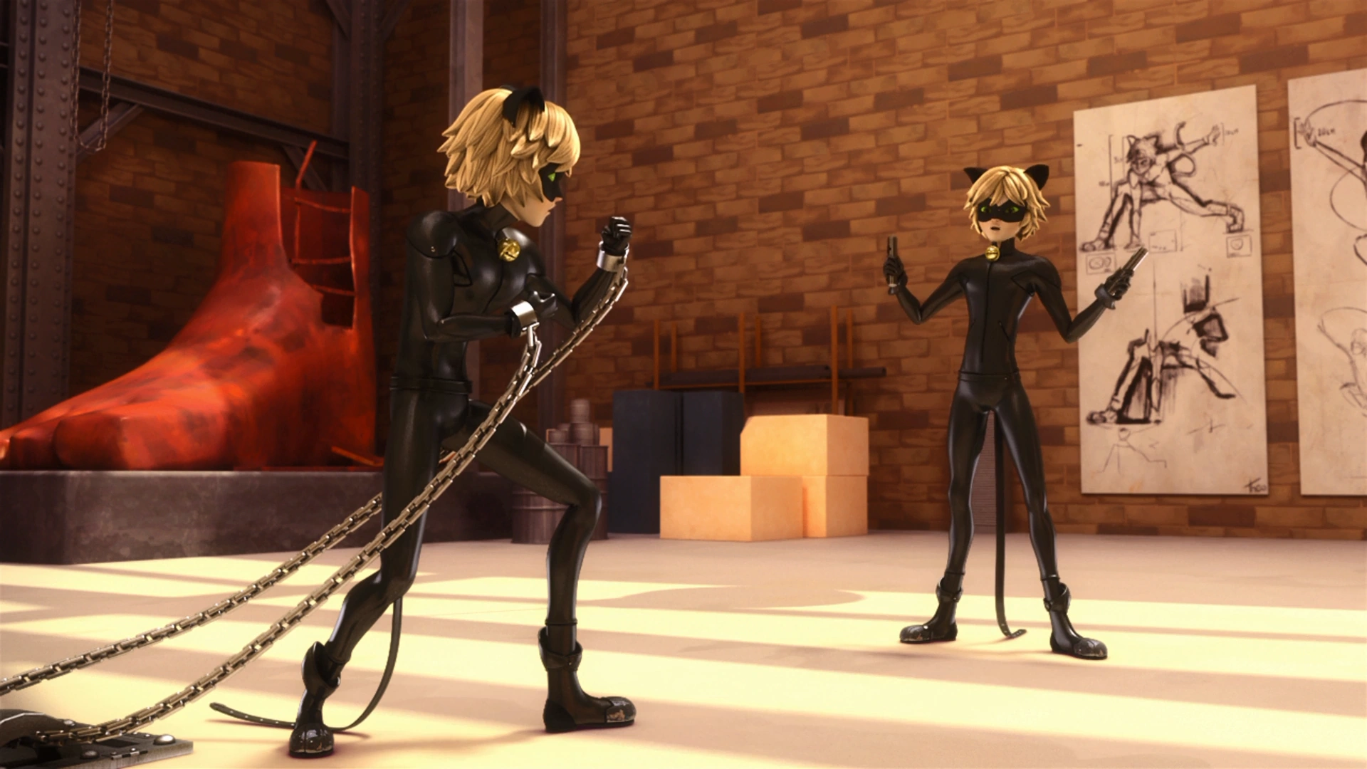 - When Cat Noir and Copycat are fighting, Cat Noir is mostly on the left.