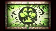 Dark Grimalkin wears dark grey chain-mail armor that is covered by a long black tunic. The tunic has a bright green cat paw logo on his torso. He wears black boots and gloves. He also wears a removable black helmet with triangular protrusions similar to cat ears.