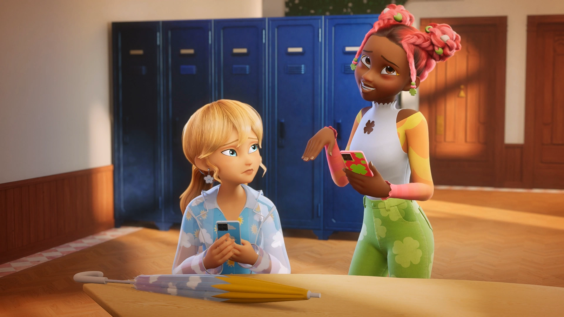 In "Sleeping Syren", Diane eats lunch with Ondine, Marinette, Alya, Juleka, Rose, Kagami, Mylène and Zoé, having conversations about their boyfriends. When Ondine states that he is unsure if Kim loves her or not, she suggests to ask Kim to let him know that she wants to kiss. Outside the Collège Françoise Dupont courtyard, Diane and Mylène agree with Ondine to not force him to kissing. Diane and the other girls watch through the doorway witnessing Kim refusing to kiss Ondine much to the girls' dismay of Kim hurting Ondine's feelings. After the incident of Sleeping Syren, Diane suggests that she should carry a swimsuit everywhere she goes, never knowing about the weather. After watching Kim and Ondine kiss each other, Diane and the girls feel awkward, deciding to leave the cafeteria.