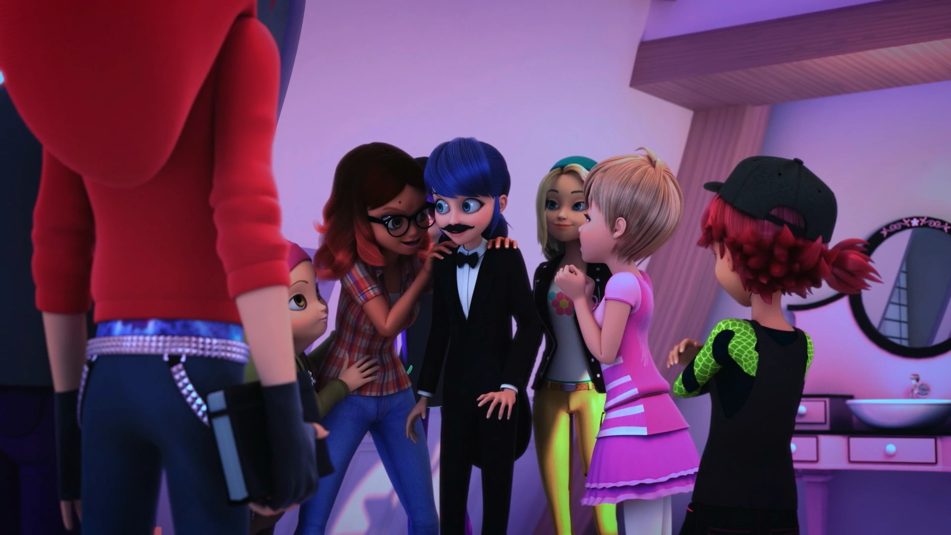At the hotel, Zoé boldly convinces the butler that the location of the soirée had changed, and then informs the rest of the success. In Marinette's room, the group dresses her up as butler Marino.