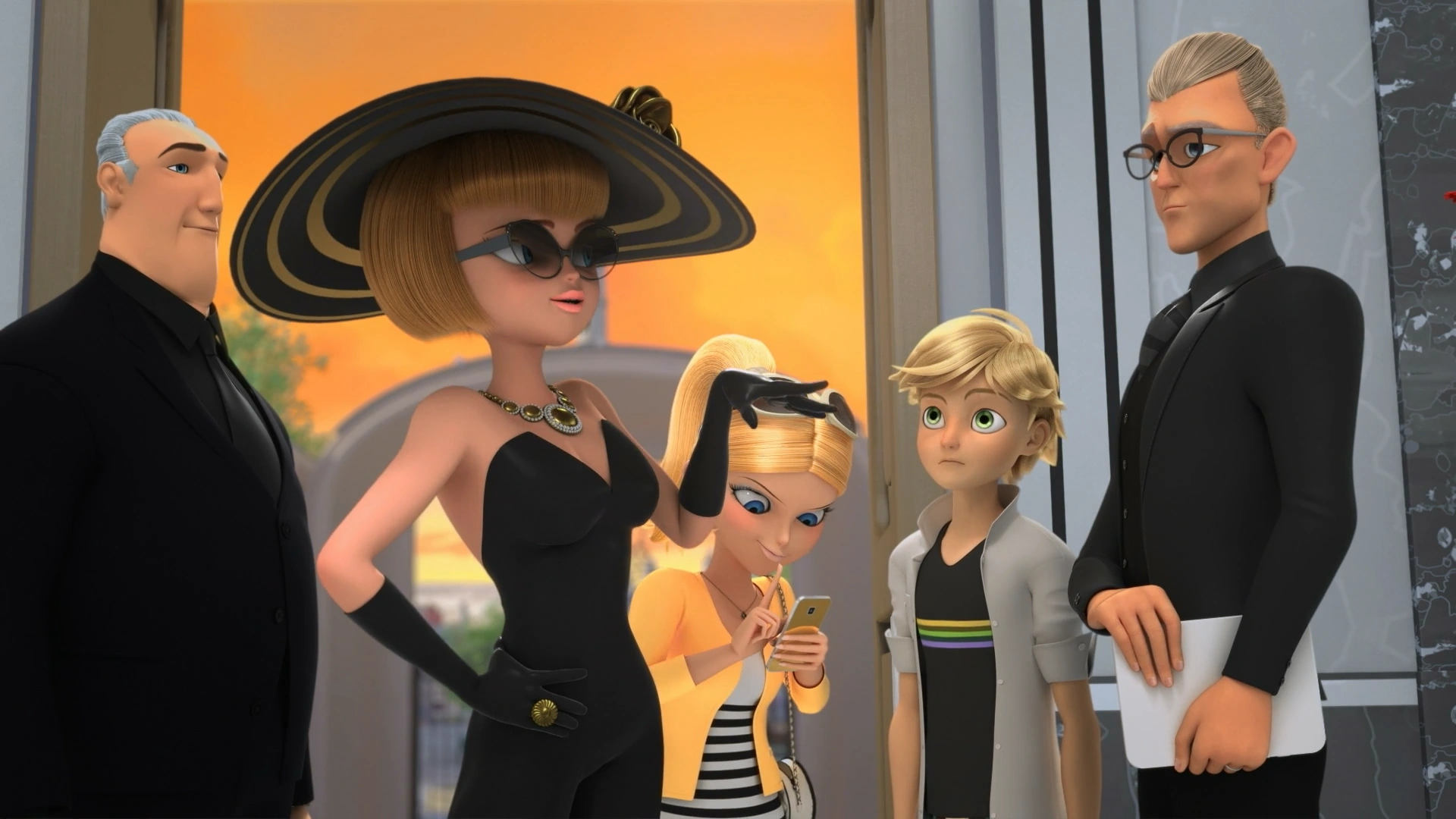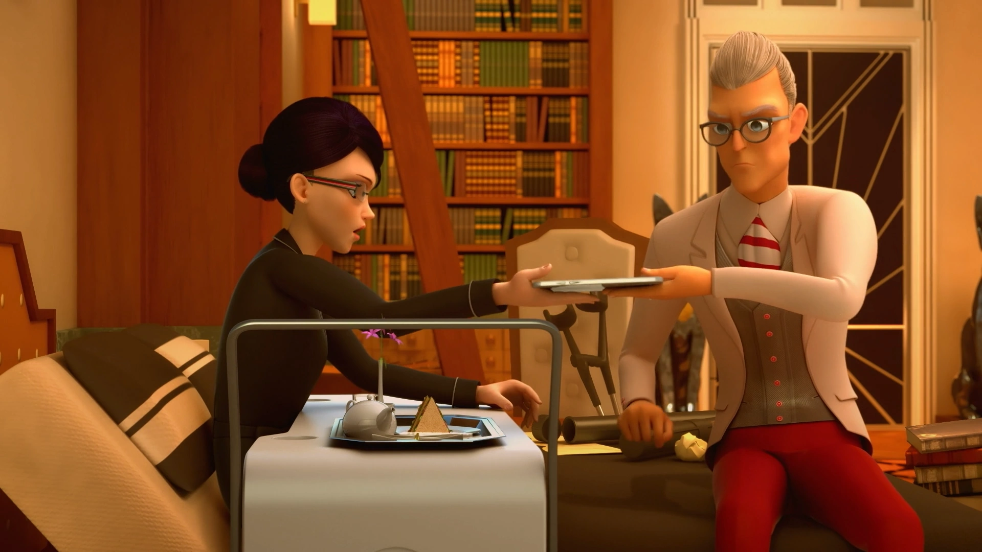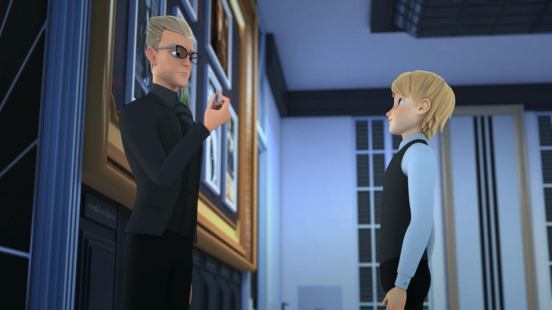 In Nathalie's room, Adrien brings Nathalie lunch. Adrien laments that he wouldn't have his friends over, and Nathalie counters that the club members are important to Gabriel. Adrien mumbles that his friends are important to him when Gabriel enters the room and asks Adrien to leave them for a moment. Once Adrien leaves, Gabriel says that organizing the soirée is hard without her help, but he would not cancel it, given that, firstly, the guests wouldn't understand, and more importantly, Amélie and Félix were coming. Nathalie gives Gabriel instructions on her tablet and offers him a sandwich.