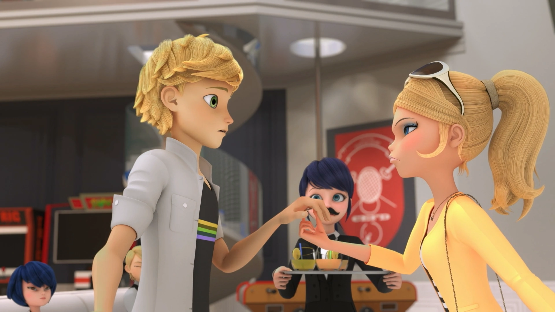 Marinette's friends nervously await in her room, and Marinette comes in, tired but triumphant. Marc and Nathaniel tell her that they were inspired to write a new comic: "The Adventures of Marino, the Clumsy Waiter".