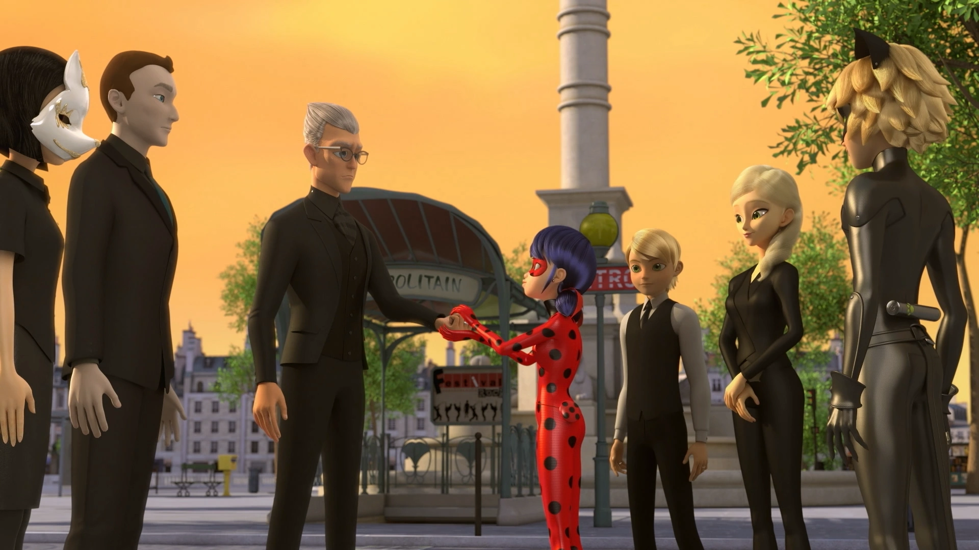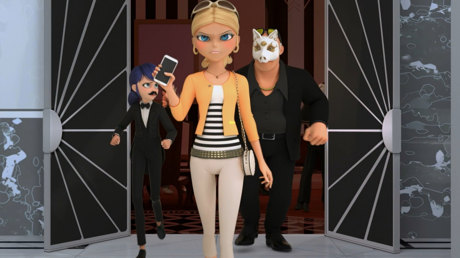 At the Agreste mansion, Gabriel prepares for the soirée, following the list, and leaves the bodyguard in charge of the cellphone scramblers. He stands at the entrance, welcoming his guests, checking their identities and handing them masks. Marinette goes over to a waitress and introduces herself as Marino, claiming that the regular waiter was sick. Sarah, the waitress, explains that they'll be taking care of food prep and overseeing the children, and would have their identities checked by Gabriel's fingerprint scanner. Marinette grabs a large box and successfully enters the mansion, avoiding the identity check, to what her friend cheer. Gabriel greets the Bourgeois family but is soon interrupted by Chloé, who tries to show him the video. Marinette purposefully trips with the box to distract them, causing Gabriel to drop his tablet. Adrien helps Marinette up, wondering if he knows her. Chloé fails to get Gabriel's attention. Amélie and Félix arrive just as Gabriel picks up the tablet and fixes his tie, and Félix notices the brooches under the tie. Amélie thanks Gabriel for letting Félix, who smiles innocently, keep the family's ring, and Adrien points out that it was very thoughtful of him.