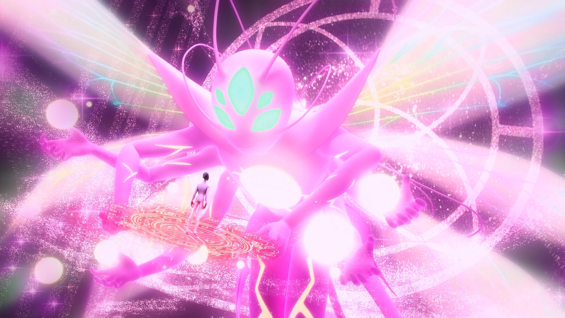 Gimmi is a large creature that is a pinkish combination of both the kwami of Creation (Tikki) and the kwami of Destruction (Plagg). They have four wings, two on top, and two on the bottom, and they're full of sparkles. They also have five turquoise eyes with no pupils.