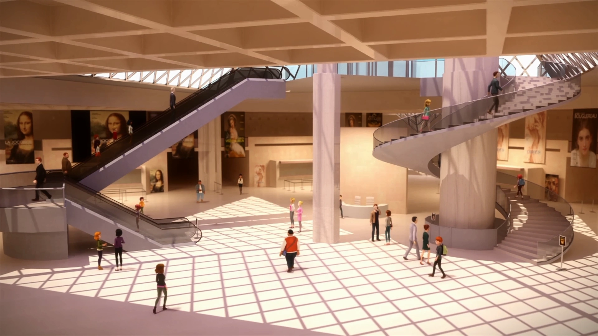 The Hall Napoléon is a huge two-story hall located directly beneath the Louvre Pyramid. The revolving entrance door leads directly to a spiral staircase wrapped around a column and an escalator that leads to the lower level of the hall. Empty cabinets and bas-reliefs can be seen near the wall, and in the distance the entrance to the rest of the museum. The main decoration is the numerous posters promoting the current exhibitions in the museum.