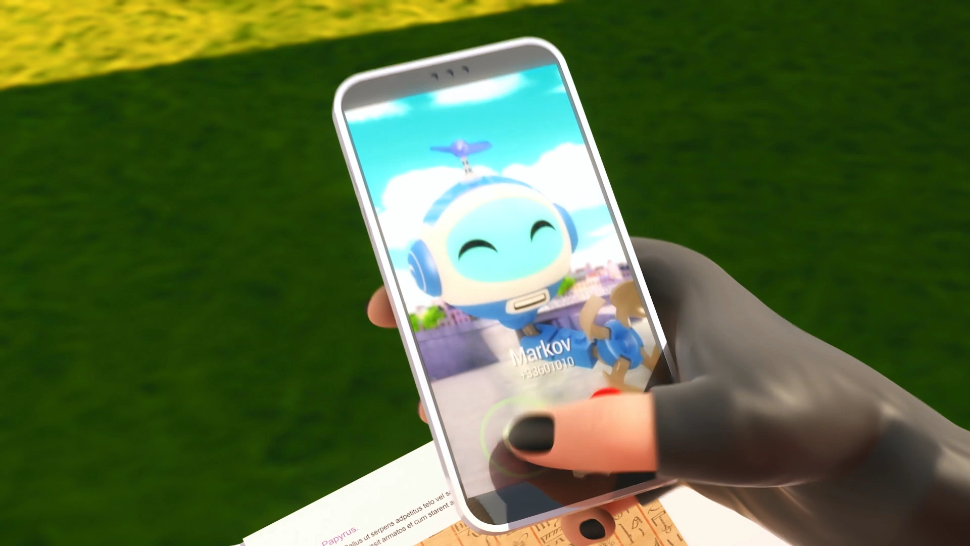 Markov is a small robot that is mostly blue and gray. On top of his head, he has a propeller with a blue blade and a black shaft with white stripes. Moreover, Markov has a transparent blue tactile sensor, a gray face with a button that has a blue heart engraved on it, a brilliant opal/luminous vivid cyan screen that has two pupil-less black dots which resemble his eyes, and two blue ear-like round sections on his sides that have a white outline and a musical symbol on the center of each ear. Below his head, Markov has a white USB port, and attached to his body is a blue and gray mechanical arm that has a gray claw and black palm.