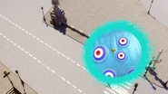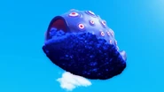 Mega Leech was a large floating round blob-like grub worm sentimonster. Its body was colored shaded blue and it had multiple red eyes of varying sizes across its body, except on its belly. The red eyes had purple-white sclera followed by a purple skin outline, resembling Malediktator's sash. It also had a large, open mouth with swollen dark blue lips.