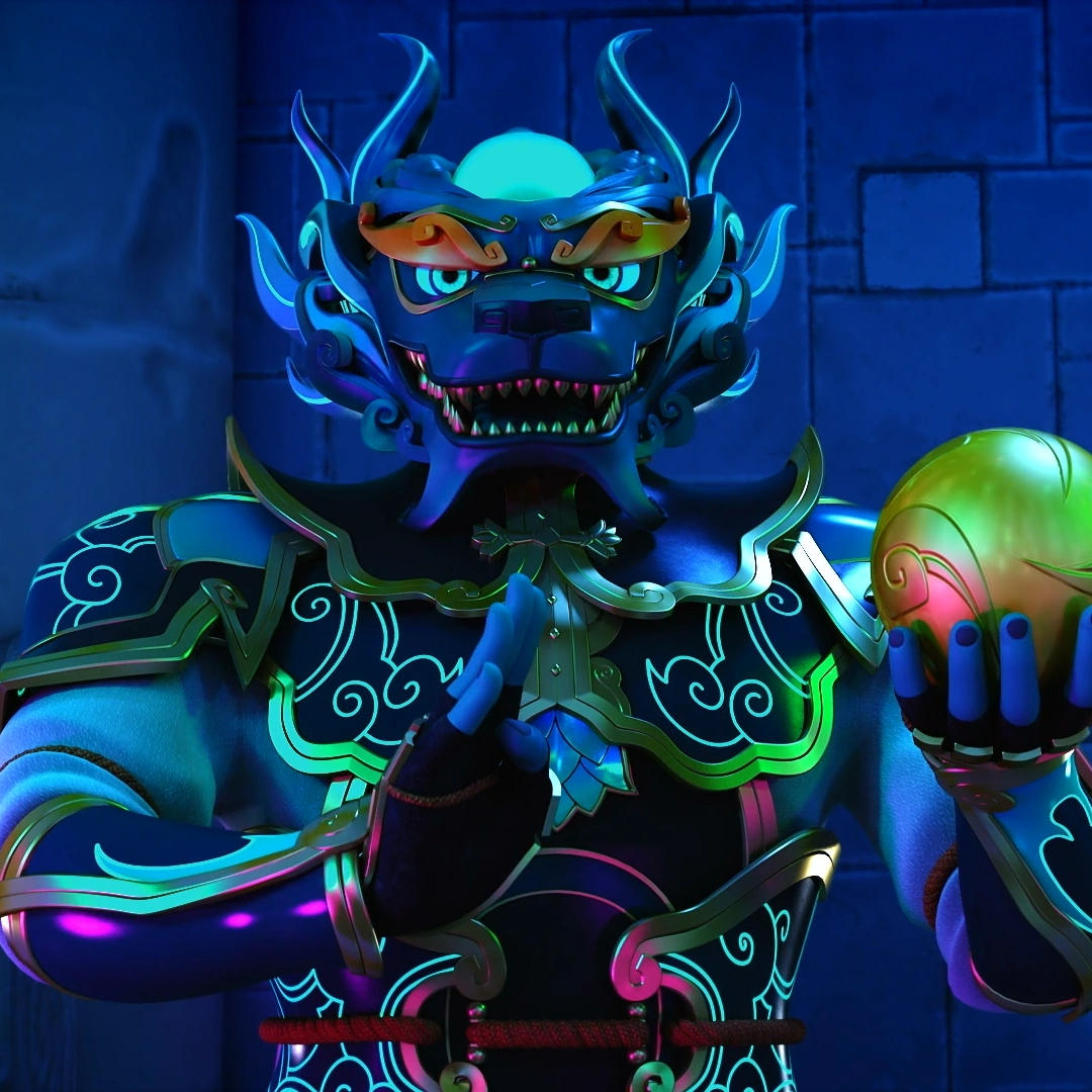 Mei Shi was a humanoid lion navy blue colored statue covered in black armor with gold markings, had a cyan sphere at the top of his head with cyan eyes while holding a golden orb in his hand.