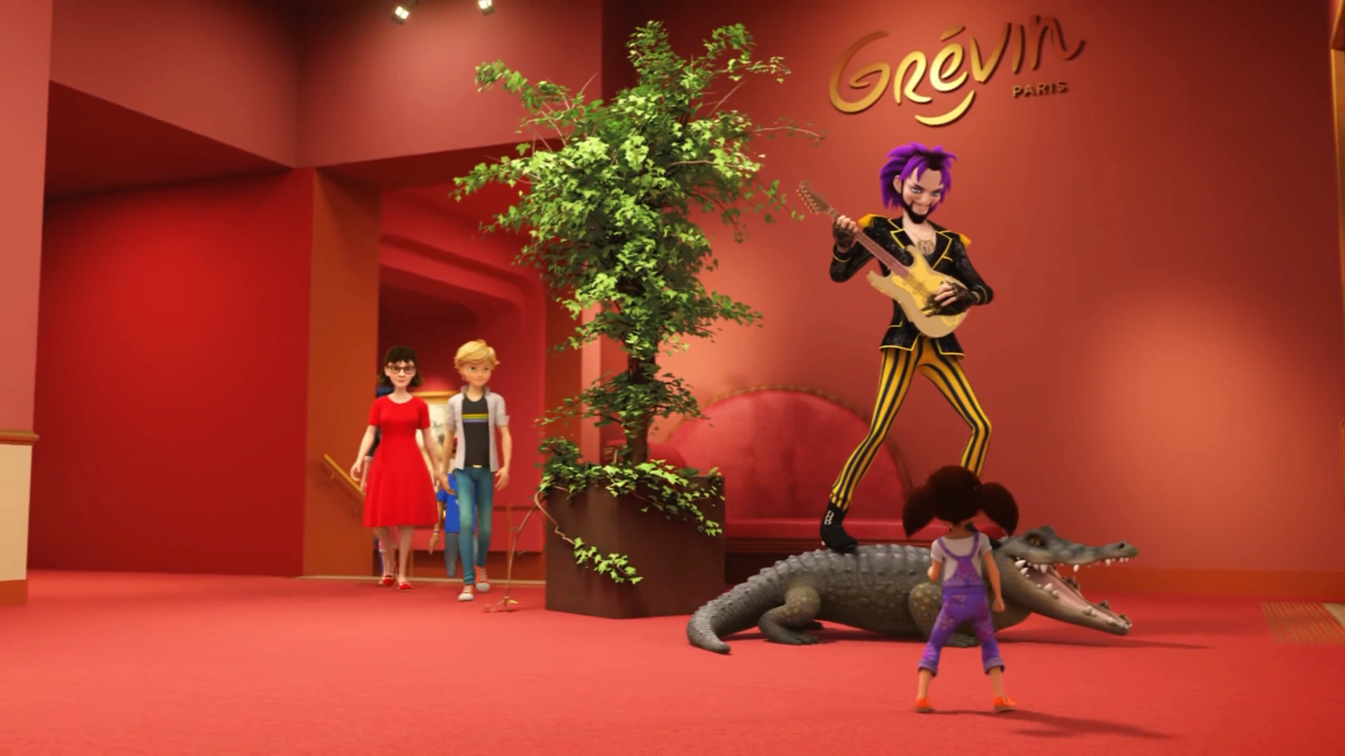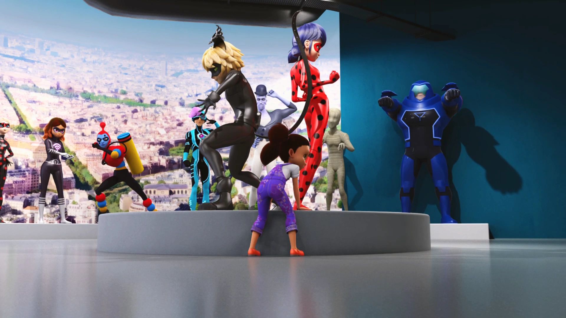 In the center of the circular room are statues of Ladybug and Cat Noir standing back-to-back on a low platform. Along the walls, which are painted to look like birds eye view of Paris, are statues of various akumatized villains.