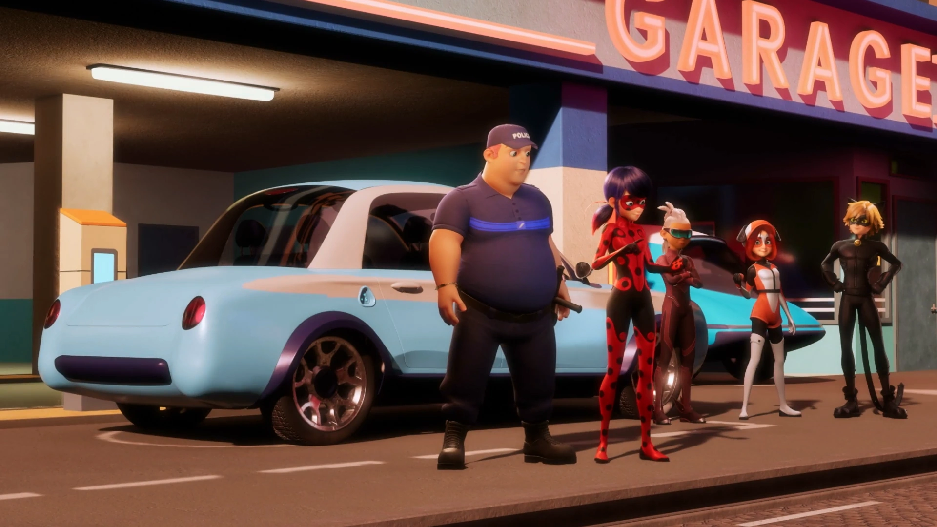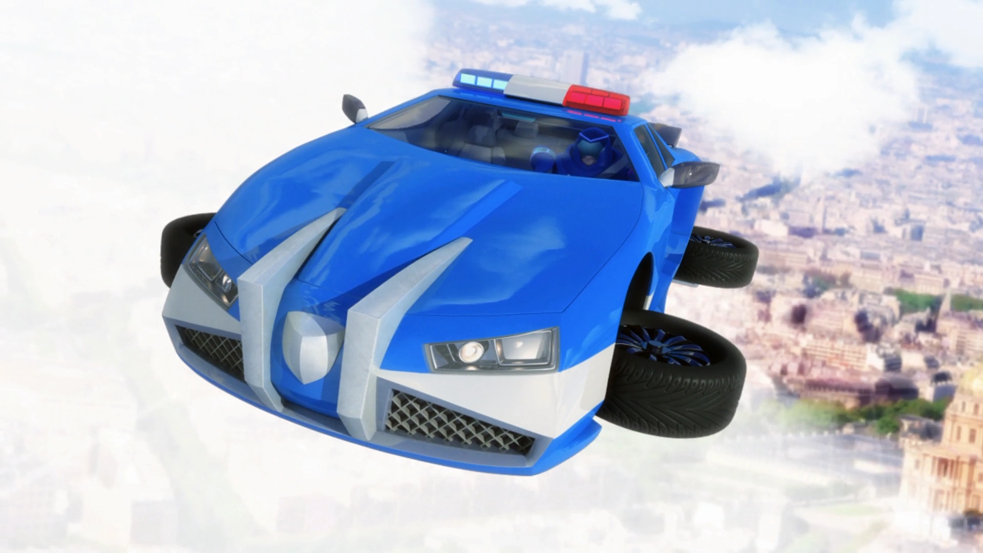 Under the effects of Roger's akumatization in Rogercop, the vehicle had transformed into an all-blue coupe car with a blue line running from the front of the bumper to the center of the rear doors. Its hood was very extended and it had a more voluminous bumper. There was also a silver police symbol. The car had a double blue-white-red flashing light on the roof and a spoiler on the trunk.