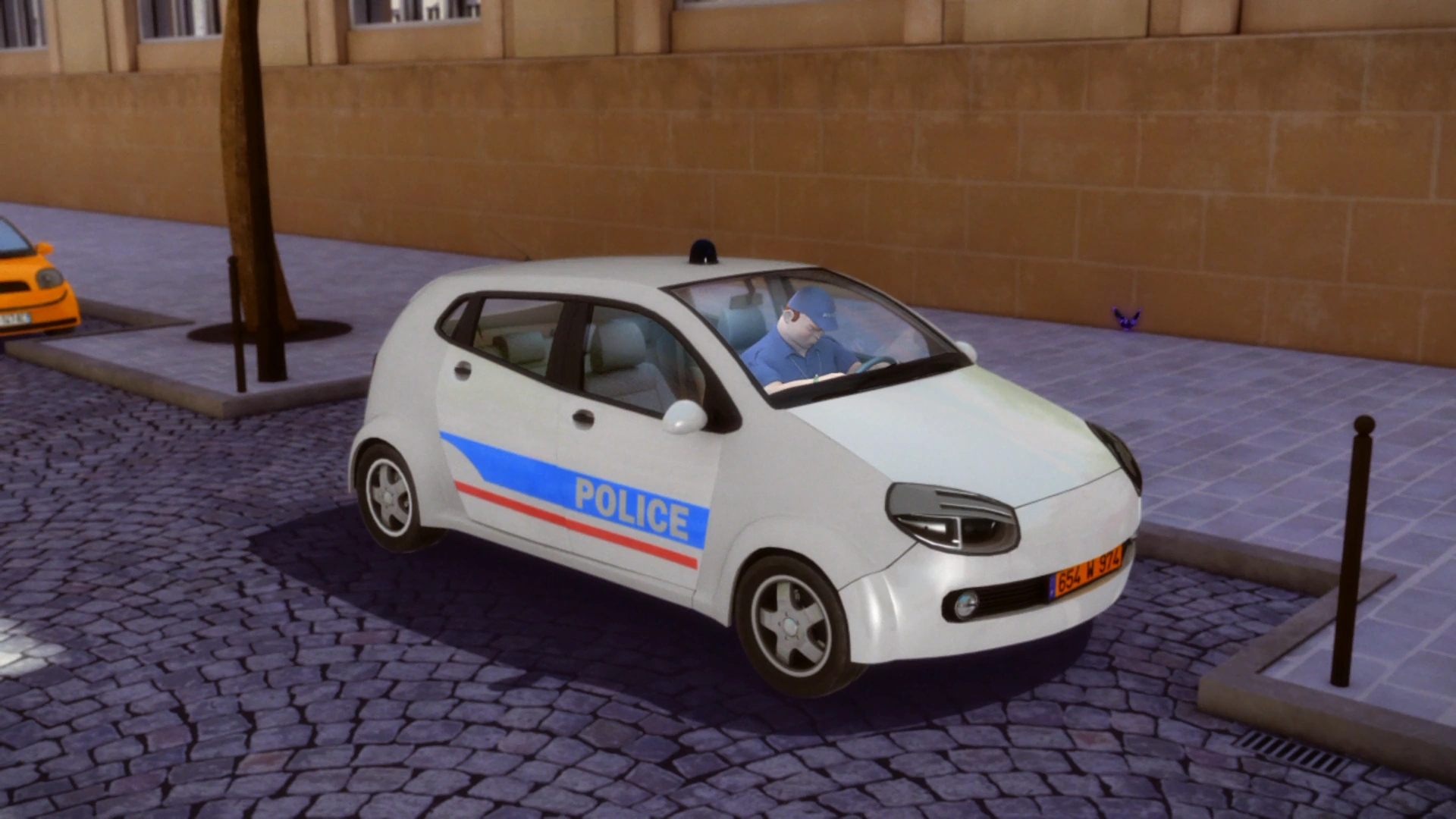 The car looks like a small, slightly rounded white city car. It has a blue "Police" lettering on the cap. The doors each have a large rectangular blue line with a white "Police" lettering and another thinner red line parallel to the previous one. It also has a large front windshield and a single blue headlight on the roof. At the rear, the vehicle has a storage compartment.
