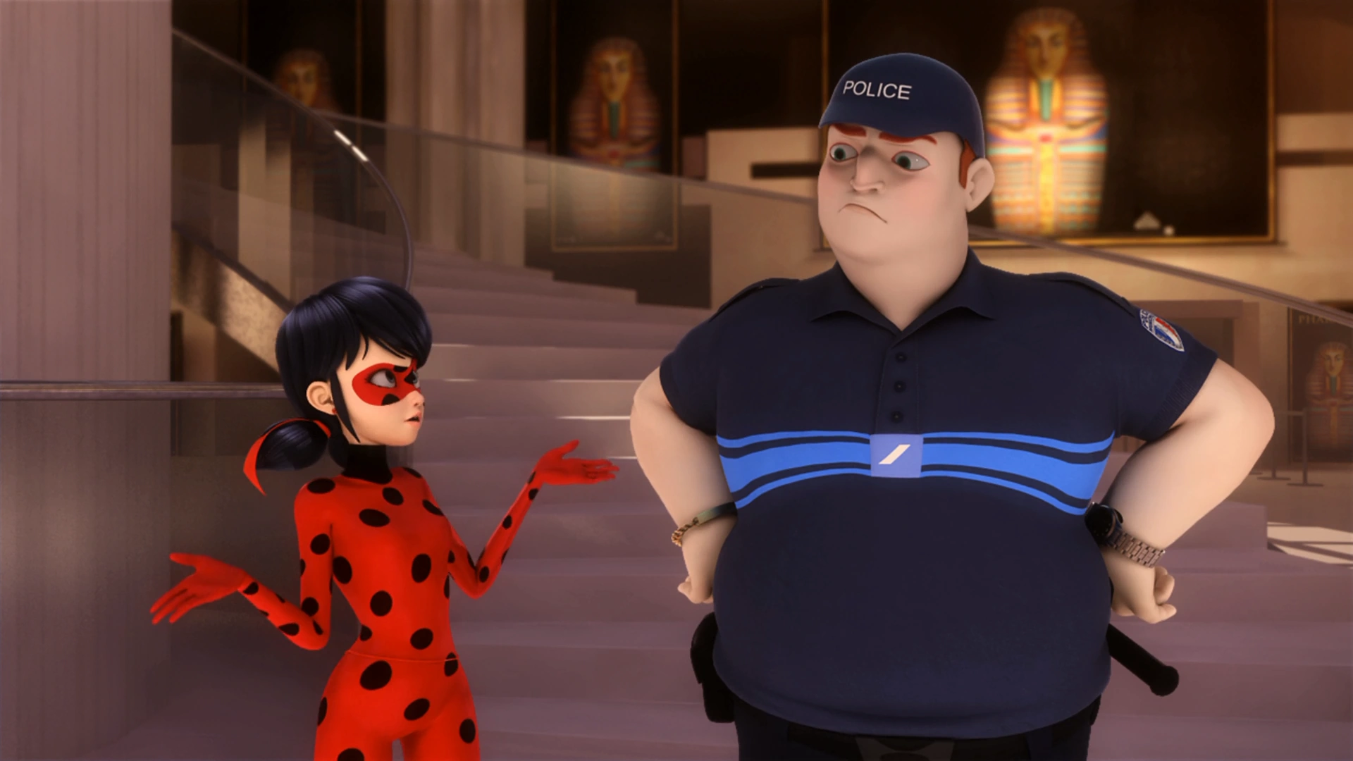 With Ladybug, Roger appreciates her and Cat Noir's work as long as they don't cause any trouble for the public or the police. In "Stoneheart", he accuses Ladybug of failing with Stoneheart previously and commands for her and Cat Noir to stay out of the police's way. The police officer and superhero also disagree about Cat Noir's innocence in "Copycat". Although stubborn at times with Ladybug, he knows that she truly cares about protecting Paris. In particular situations, he openly wants her and Cat Noir to save him and others, like when he and other police officers get captured by the titular villain in "Mr. Pigeon". Also, he sometimes shows pure gratitude towards her and her heroics, including when she destroys Hawk Moth's Akuma projection in "Stoneheart" and when her Miraculous Ladybug returns the Mona Lisa in "Copycat".