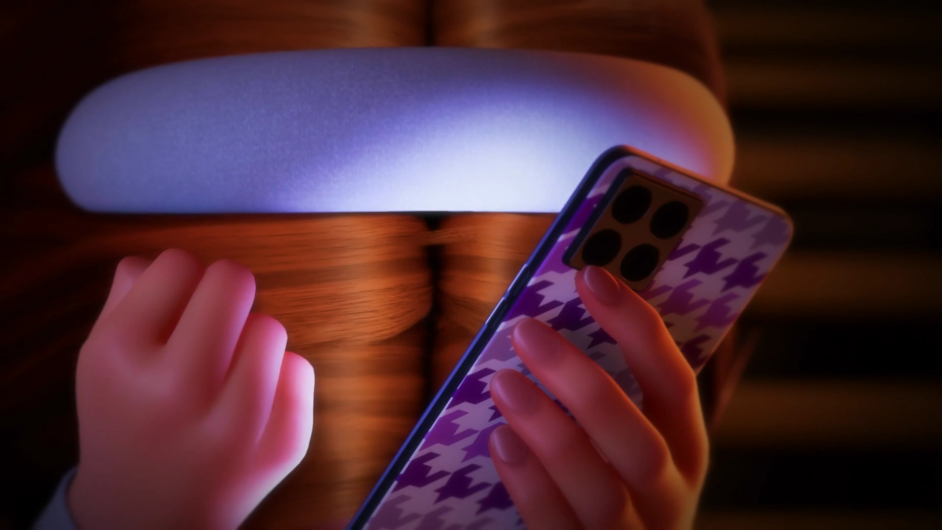 Sabrina's phone has a solid white case with a black, square lens.
