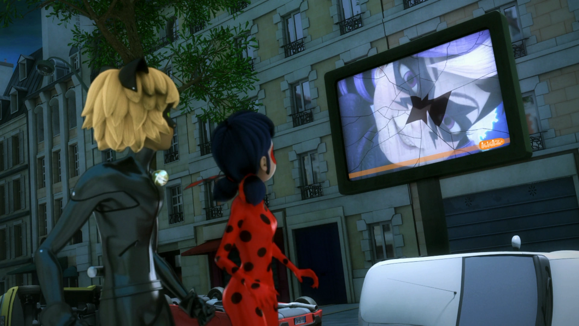 Ladybug opens one of the bus's windows and holds on to Cat Noir's staff. Cat Noir lengthens it, allowing Ladybug to get out and pull him up afterward. A nearby digital billboard turns on, revealing Stormy Weather giving the weather. She casts all of France in eternal winter, and it begins to snow. Cat Noir brushes her threat off, stating that he would've looked good in a swimsuit. In the same tone, Ladybug responds that the catsuit is good enough. She knows where Stormy Weather is. Together, Cat Noir and Ladybug rush to the KIDZ+ studio.
