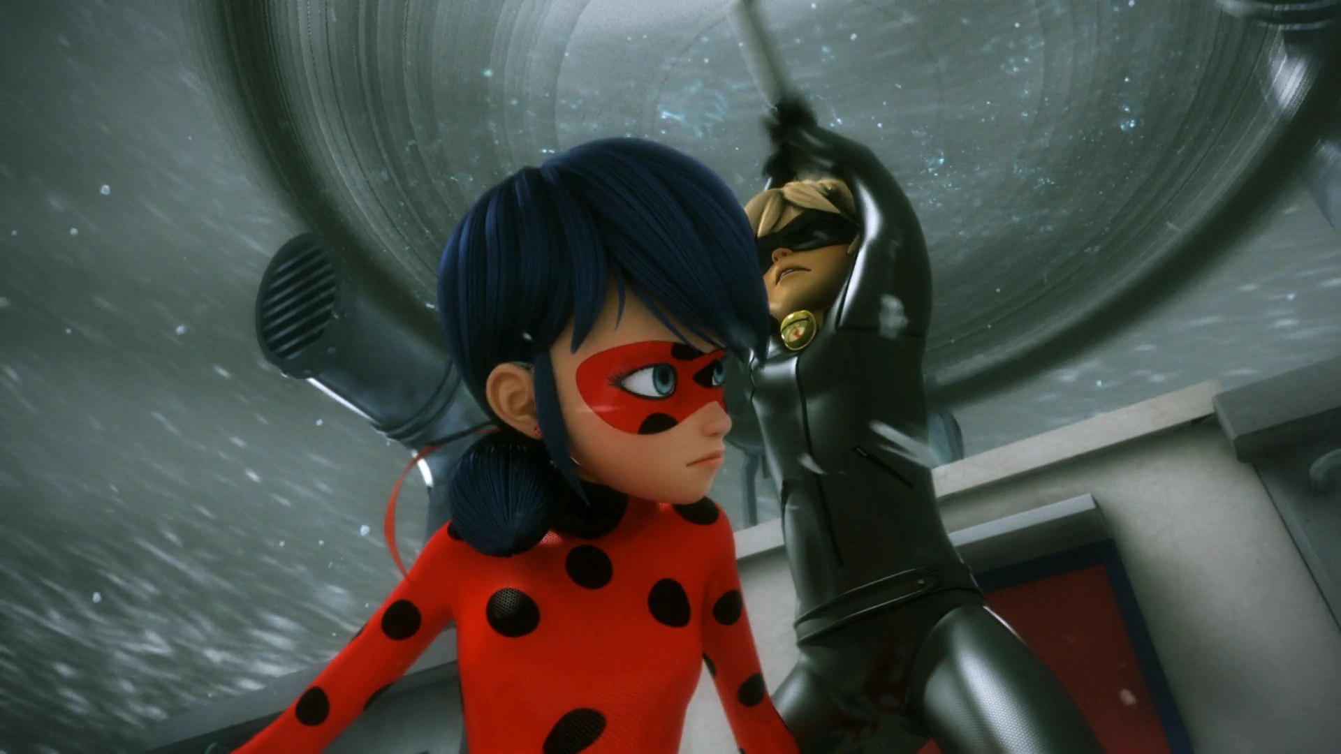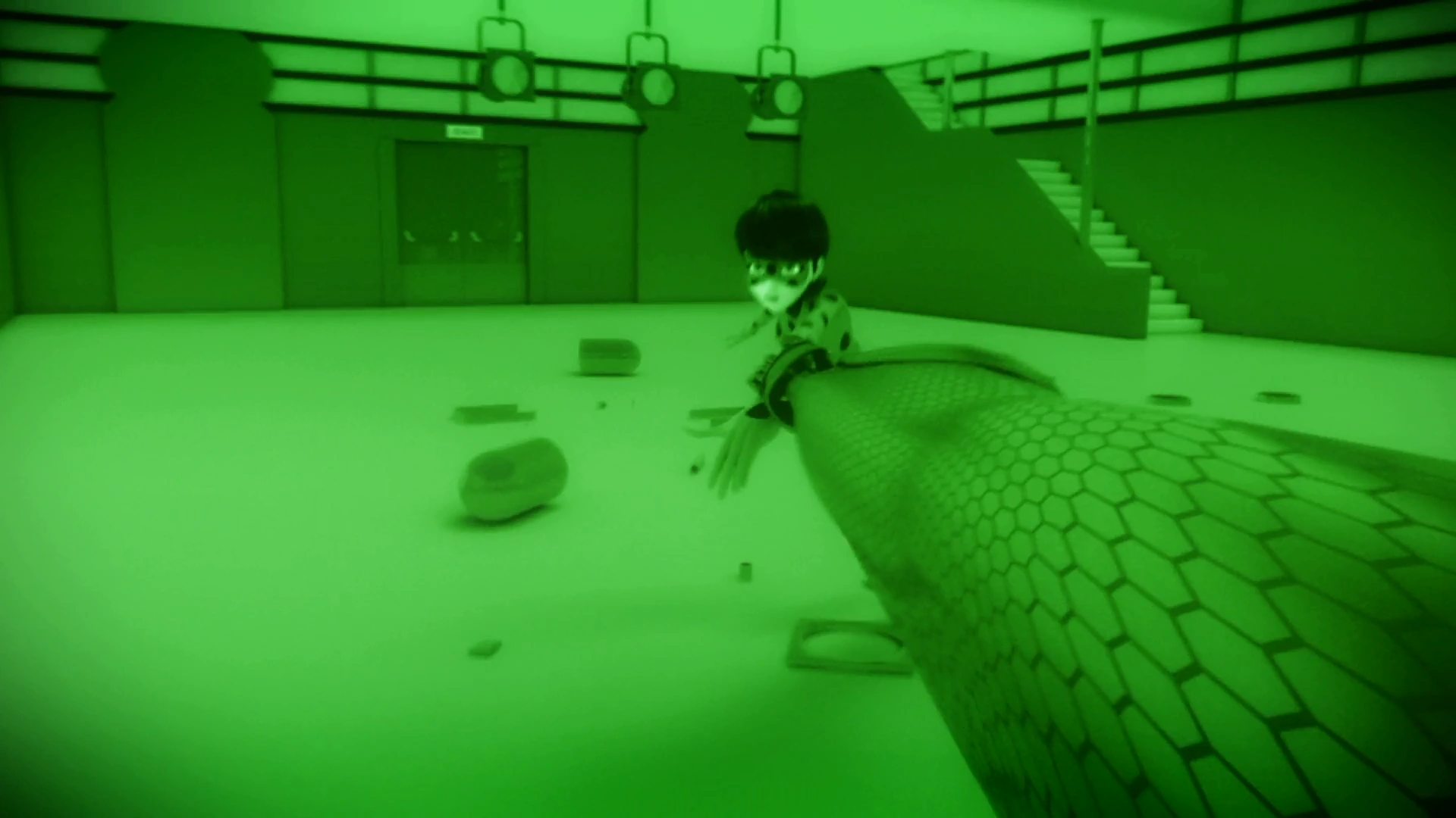 Ladybug stumbles, unable to find her way in the dark. Cat Noir grabs her hand, able to see due to his night vision. He leads her through the building and up two flights of stairs. Ladybug protests, but when she is hit with a fire extinguisher by Stormy Weather, she allows Cat Noir to continue leading her. They end up on the roof, Cat Noir holding Ladybug's hand. Stormy Weather cackles, releasing a cyclone around the building.