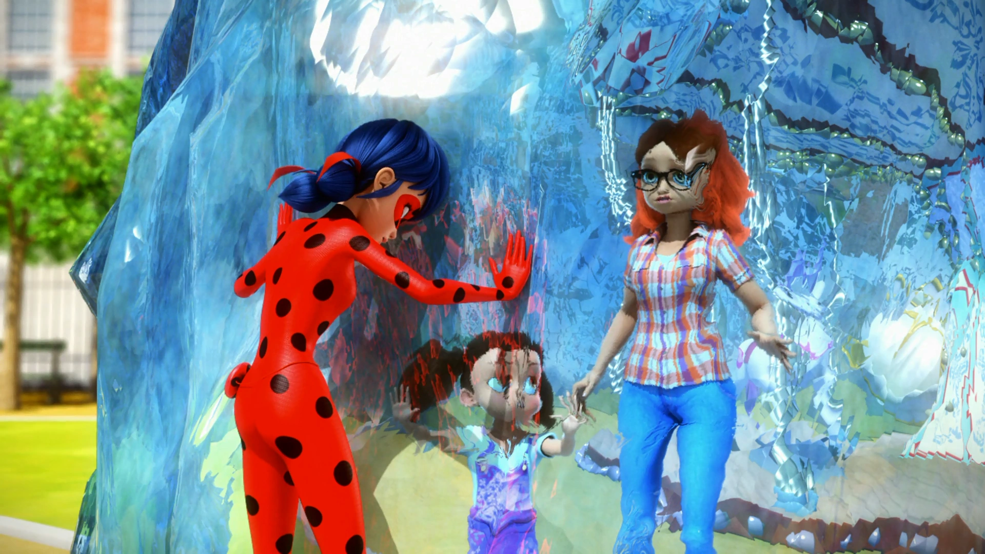 Ladybug runs over to the carousel, determined to free Manon and Alya. Getting her yo-yo, she wraps it thrice around the ice and pulls, but the ice is way too slippery and smooth for her yo-yo to do anything. The yo-yo comes free, hitting Ladybug on her head and causing her to fall back. Getting up, she runs over to Manon and Alya, reassuring them that she will free both of them. Ladybug accidentally calls Manon by her name. She covers up her slip by saying Marinette found her and told her about Manon. Alya nods at the superhero, pulling Manon away distracting her as Ladybug runs off to find Stormy Weather.
