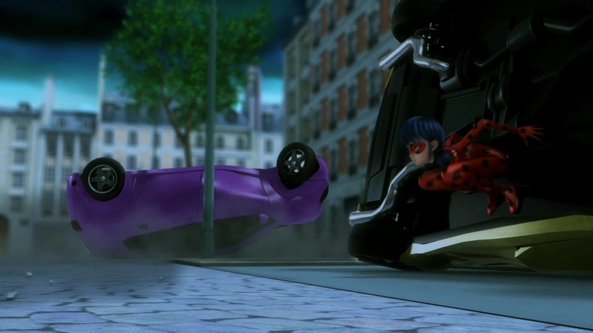 When the wind stops, the heroes fall. Cat Noir bounces back to his feet, ready to chase Stormy Weather, but Ladybug stops him, telling him to think before he leaps. Ladybug then runs up the side of a building. Cat Noir follows suit on the opposite side of the street. They jump off at the same time, swinging their weapons at Stormy Weather. She turns, blowing them and many cars several streets away. The two land, dodging the cars as they fall. Suddenly, a bus comes flying at them. Ladybug pulls Cat Noir close, swinging her yo-yo rapidly, as the bus falls on them. The yo-yo acts like a drill, leaving the two heroes inside the bus, safe other than Cat Noir accidentally getting hit on the head by Ladybug's yo-yo.