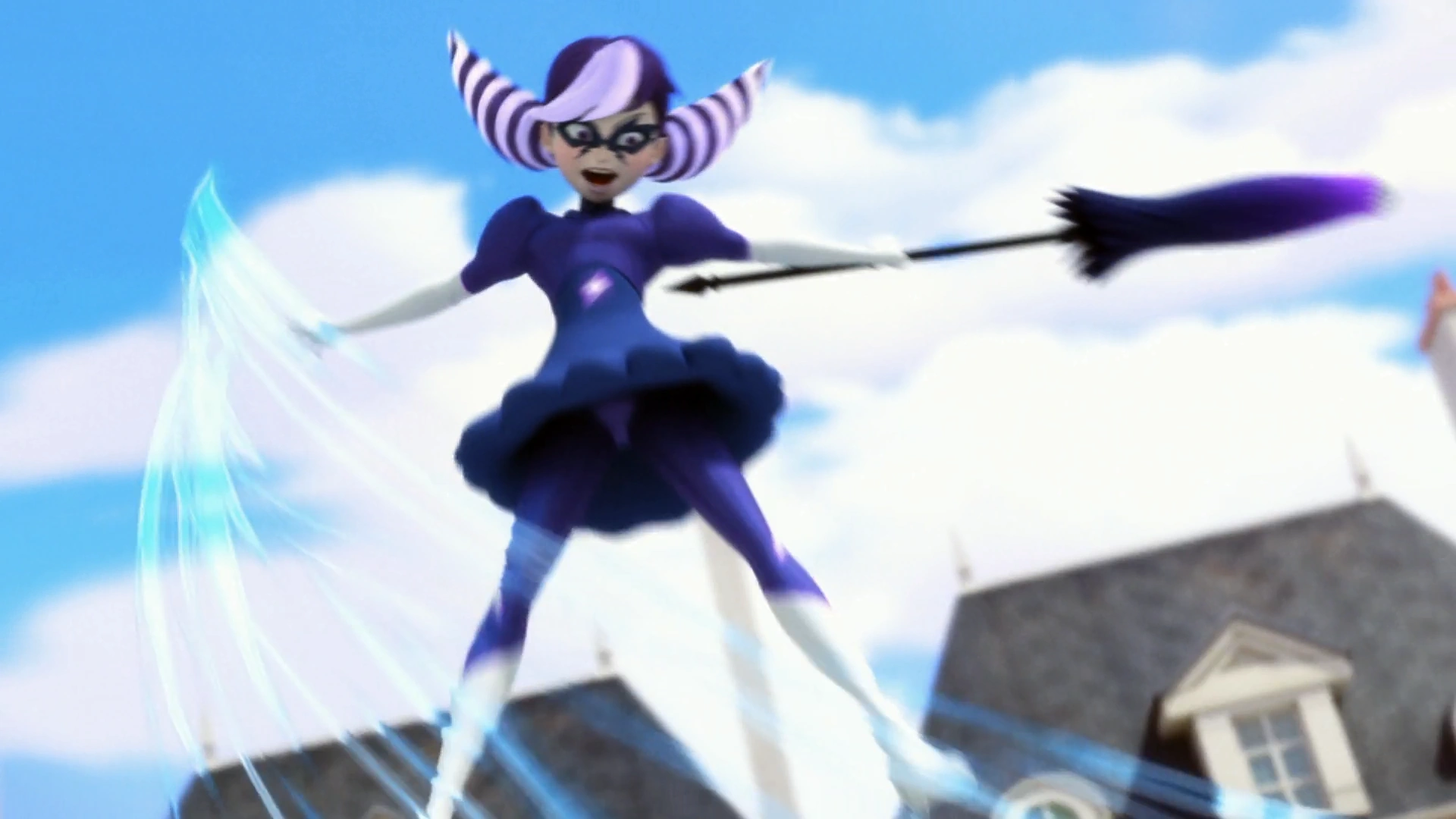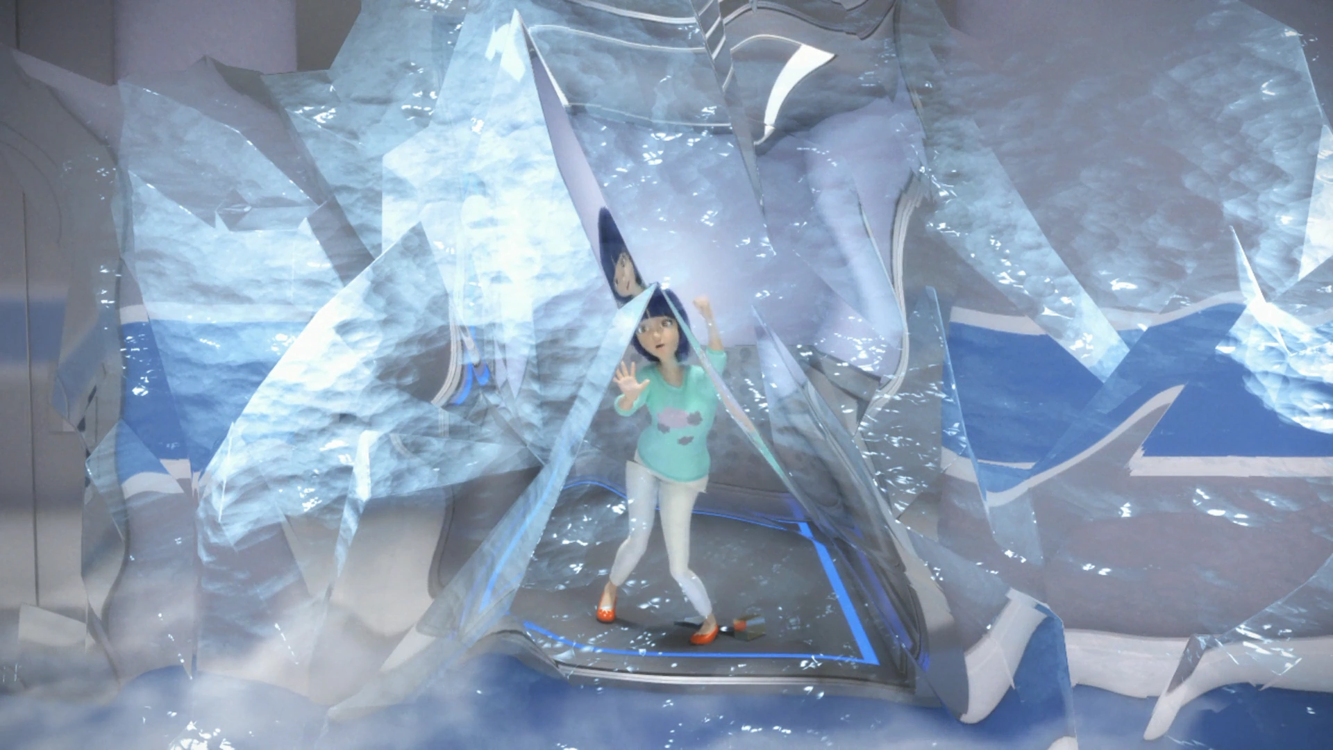 Trophy in hand, Mireille enters an elevator heading down. Before she can reach her designated floor, Stormy Weather appears and traps Mireille in the elevator by freezing it open with ice.