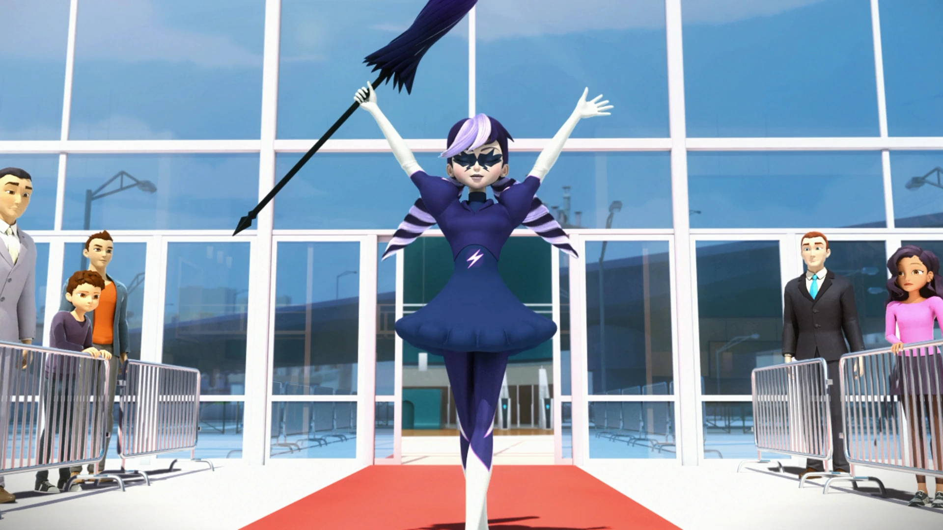The akuma finds Aurore in an elevator and embeds itself into her parasol. Hawk Moth offers to make Aurore into the best weather girl the world has seen, so long as she can get Ladybug's and Cat Noir'sMiraculouses, to which Aurore agrees. From the elevator emerges the purple and white supervillain, Stormy Weather.