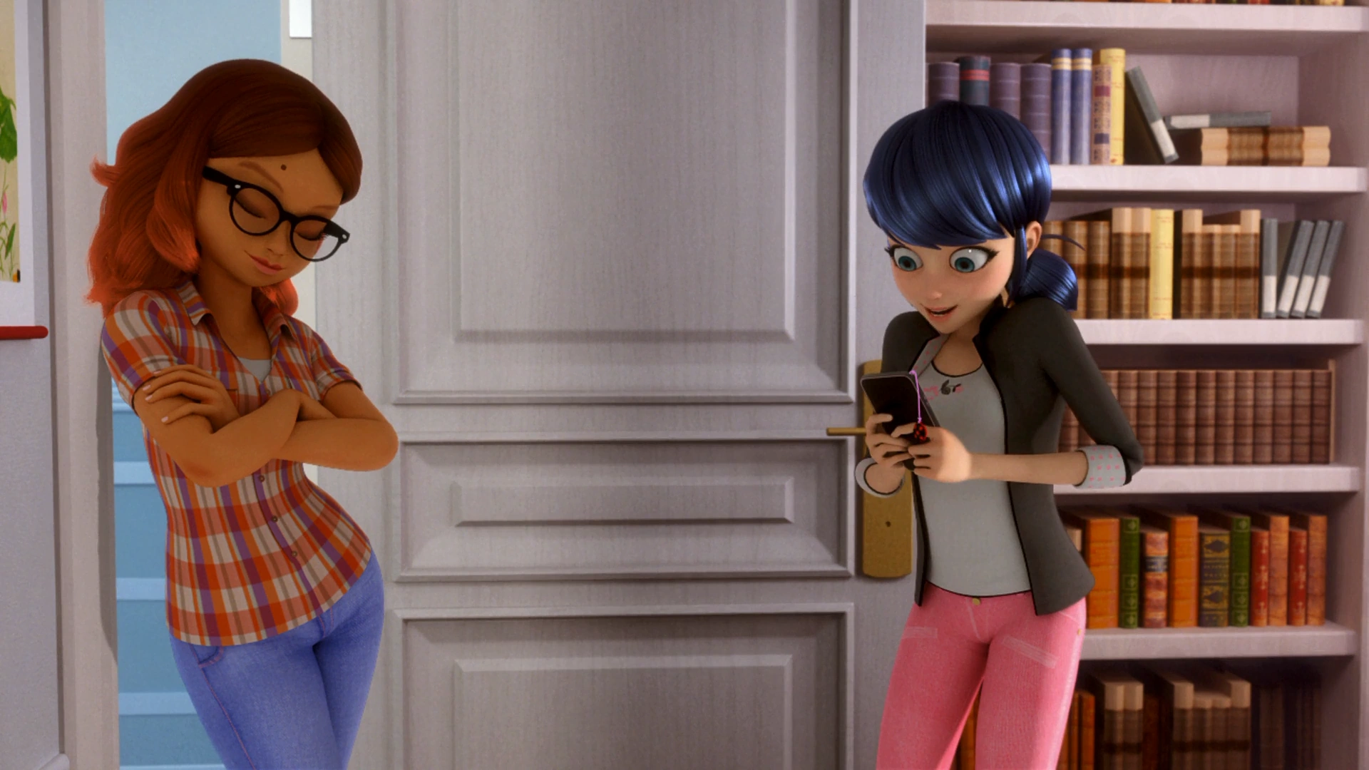 At a Parisian home, a teenage girl, Marinette Dupain-Cheng, is babysitting a girl named Manon, who steals Marinette's phone so that she can vote for Mireille. Marinette chases Manon around the living room, trying to get both her phone and hat back from her. When she gets one thing back, she loses the other. Her magical companion, Tikki, appears and offers Marinette words of encouragement. The doorbell rings, and Marinette opens it to see Alya Césaire, her best friend.