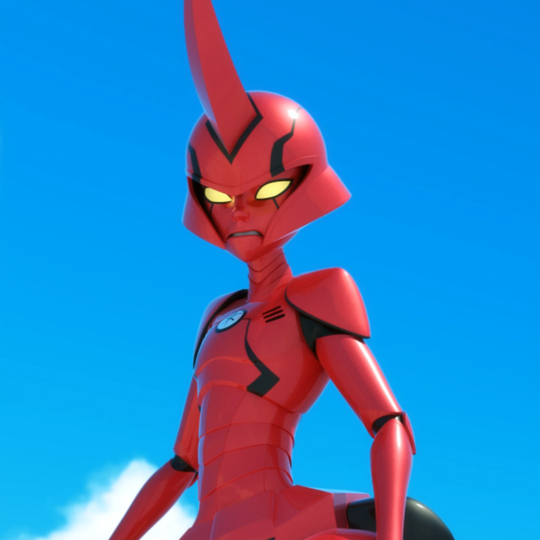 She had a more robotic face with darker, angular cheeks, matching the shape of her eyes. As shown in her resisting her akumatization, her tears were light brilliant amber. She also had a charcoal gray waist area featuring a mouth made of teeth-like fangs. She wielded her bokken as well.